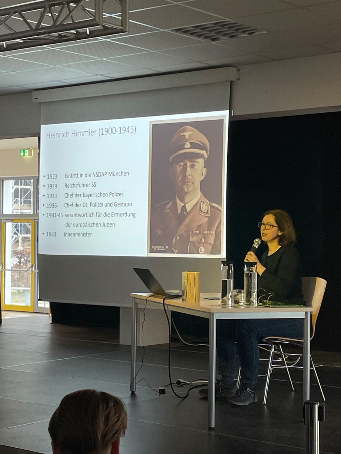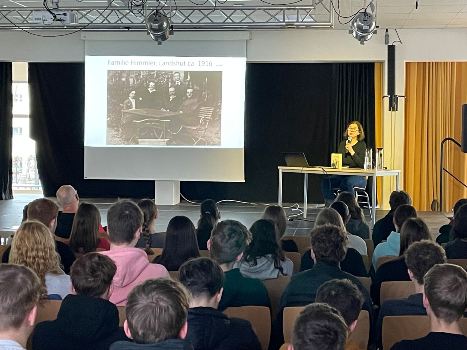 Frau Himmler, die mit ihrem Buch „Die Brüder Himmler“ bereits eine tiefgehende Analyse der nationalsozialistischen Vergangenheit ihrer Familie vorgelegt hat, fesselte die Schülerinnen und Schüler mit ihrem Vortrag, der durch vorgelesene Passagen aus ihrem Buch ergänzt wurde. Sie ging dabei nicht nur auf die Rolle ihres Großonkels Heinrich Himmler ein, sondern beleuchtete auch die Verstrickungen ihrer gesamten Familie in das NS-Regime. Besonders eindrücklich schilderte sie, wie schwer es war, sich dieser Vergangenheit zu stellen und wie sehr das Schweigen und Verdrängen über Generationen hinweg anhielt. Ihr Vortrag war nicht nur eine historische Aufarbeitung, sondern auch ein eindringlicher Appell gegen jede Form von Geschichtsvergessenheit und rechte Ideologien in der Gegenwart. So wurde den Schülern der 10. Klassen auf eindrucksvolle Weise bewusst, wie wichtig unsere Geschichte für unser heutiges Leben ist.