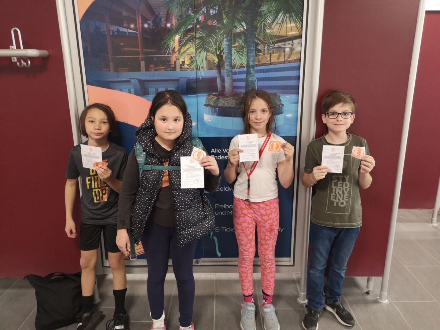 Vier SchülerInnen machten zuletzt sogar das Schwimmabzeichen Seepferdchen. Gemeinsam wussten sie sämtliche Baderegeln. Das Springen vom Beckenrand, das 25m-Schwimmen sowie das Herauftauchen eines Ringes aus brusttiefem Wasser meisterten sie ebenfalls mit Bravour. Stolz nahmen sie schließlich ihre Abzeichen entgegen.