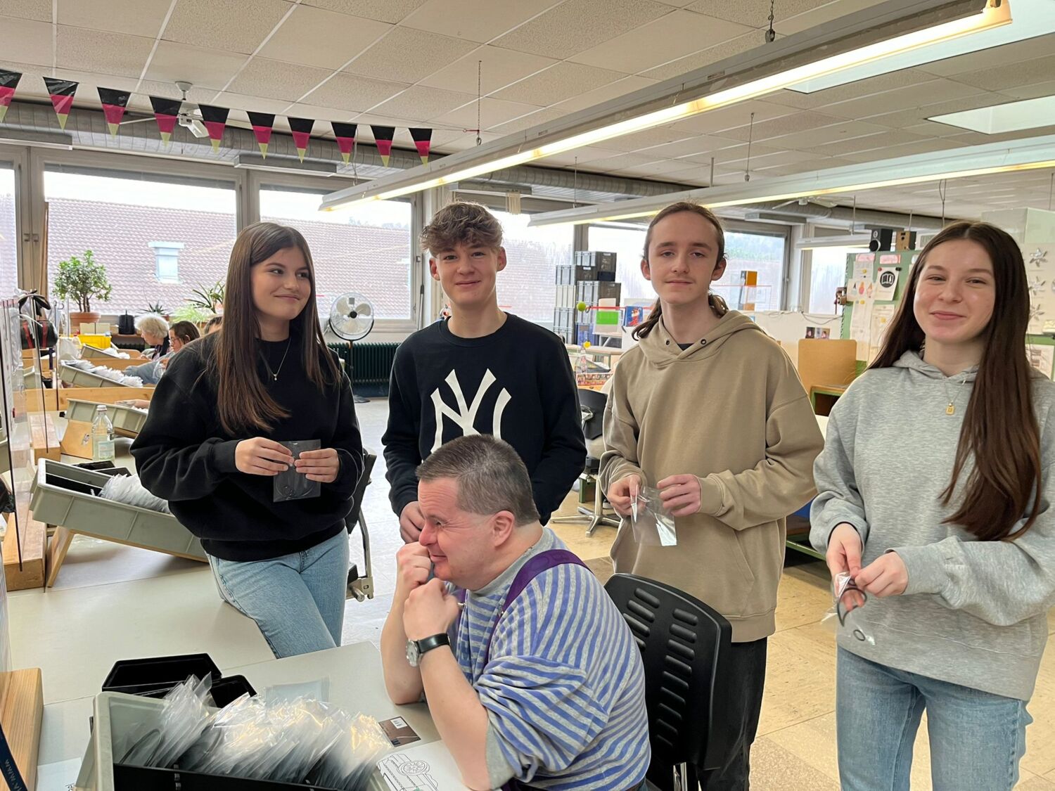 Aufgrund der fröhlichen und herzlichen Atmosphäre legte sich die anfängliche Nervosität bei den Schülerinnen und Schüler schnell und es kam zu einem regen Austausch. Vielfach durften die Jugendlichen selbst mitarbeiten. Gemeinsam mit den betreuten Mitarbeiterinnen und Mitarbeitern wurden z.B. Schachteln gefaltet oder Flaschen mit Etiketten versehen. Dabei wurde viel gelacht und beide Seiten hatten viel Spaß. Auch das gemeinsame Mittagessen war ein Highlight.