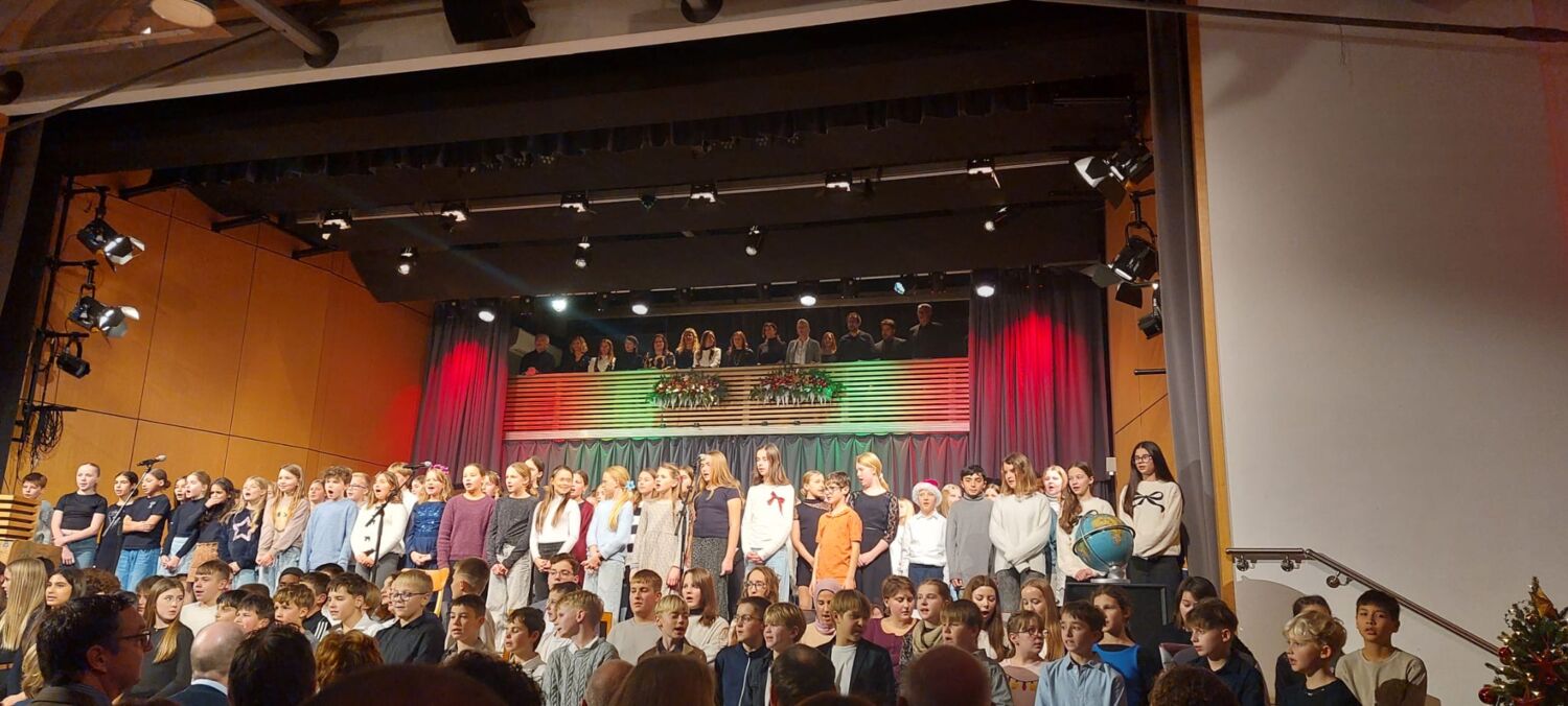 Unter dem Motto „Weihnachten rund um die Welt“ präsentierten die Schülerinnen und Schüler eine musikalische Weltreise: Vom traditionellen England, über die USA, Australien und Puerto Rico, bis nach China, Afrika und schließlich zurück nach Bayern führte das abwechslungsreiche Programm das Publikum durch die festliche Vielfalt der Kulturen. Die Klassenchöre der 5. bis 8. Klassen, der Lehrerchor, die Bläsergruppe, Instrumentalisten, Tänzerinnen und die Moderatoren, die gekonnt durch den Abend führten, trugen alle zu einem eindrucksvollen Gesamterlebnis bei. Nicht zu vergessen: das engagierte Technik-Team unter der Leitung von Herrn Höpp, das mit Licht, Ton und Organisation für einen reibungslosen Ablauf sorgte.