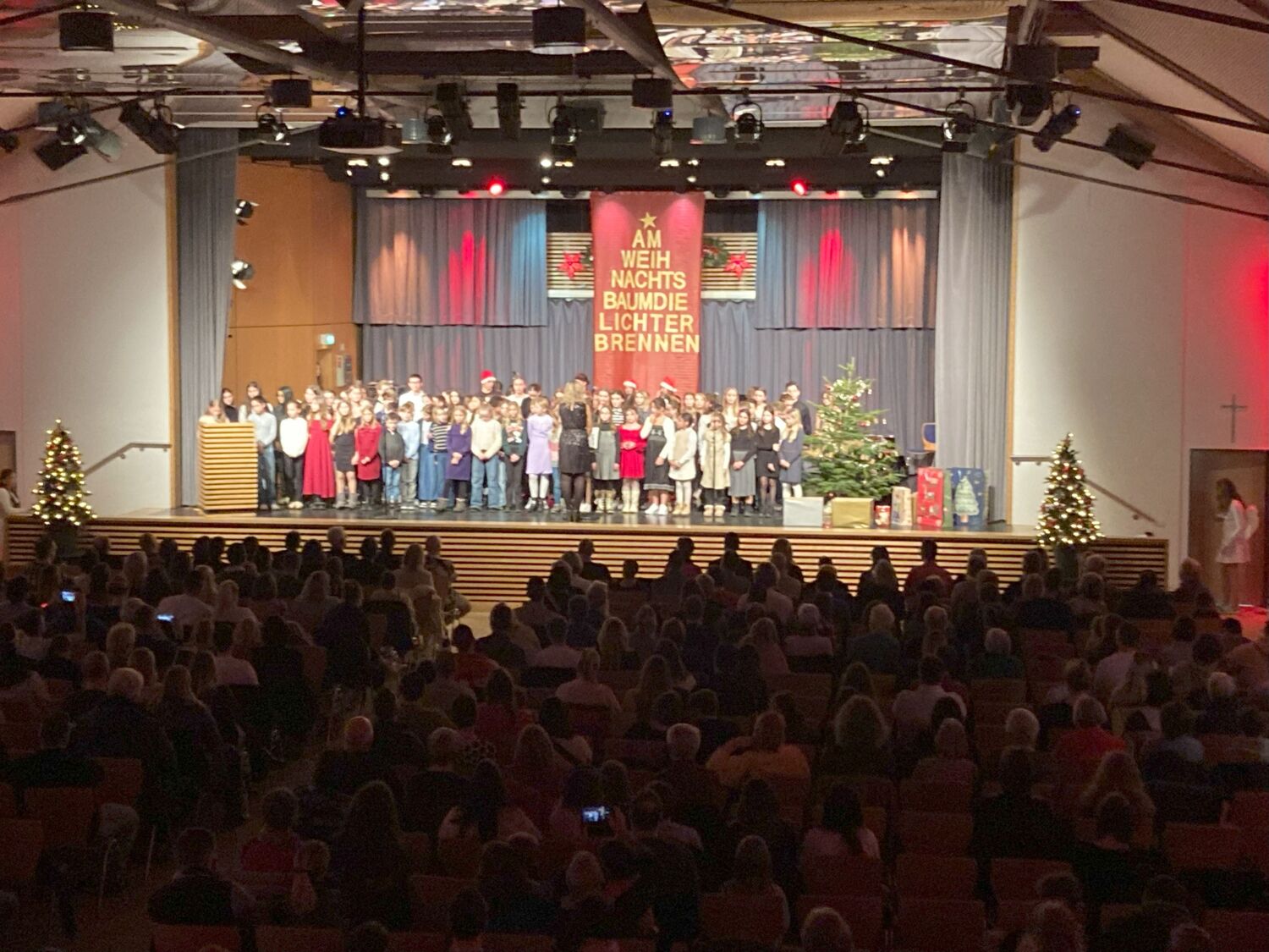Die musikalischen Beiträge reichten von beeindruckenden Solostücken bis hin zu mitreißenden Chorgesängen, die von den Schülerinnen und Schülern der Realschule dargeboten wurden. Das Technikteam sowie die Moderatoren, die als Engel verkleidet waren, ließen keinen Leerlauf im Programm aufkommen. Das Motto des Weihnachtskonzerts „Am Weihnachtsbaum die Lichter brennen“ wurde dabei immer wieder aufgegriffen, und nach jedem Abschnitt wurde ein vom Elternbeirat gespendeter Baum durch die Engel festlich geschmückt.
