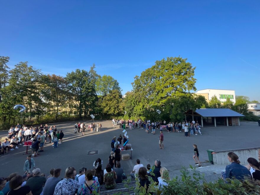 Heute hieß es für 114 Jungen und Mädchen: Auf Wiedersehen Grundschule, hallo Realschule! Bei bestem Sommerwetter trafen sich alle Schülerinnen und Schüler mit ihren Eltern im Pausenhof, wo sie von der gesamten Schulleitung und ihren neuen Klassenleitern getreu unserem Motto "Gemeinsam, des samma mia!" begrüßt wurden. Unsere neuen Mitglieder der Schulfamilie versammelten sich jeweils an mit Luftballonen geschmückten Tischen, woraufhin jeder Schüler vom Klassenleiter aufgerufen wurde und die neue Klasse dann gemeinsam in ihr Klassenzimmer ging. Nach allerlei wichtigen Informationen zur Realschule, Kennenlernspielen und dem ersten Pausenspaß ging ein spannender erster Schultag schon wieder zu Ende.